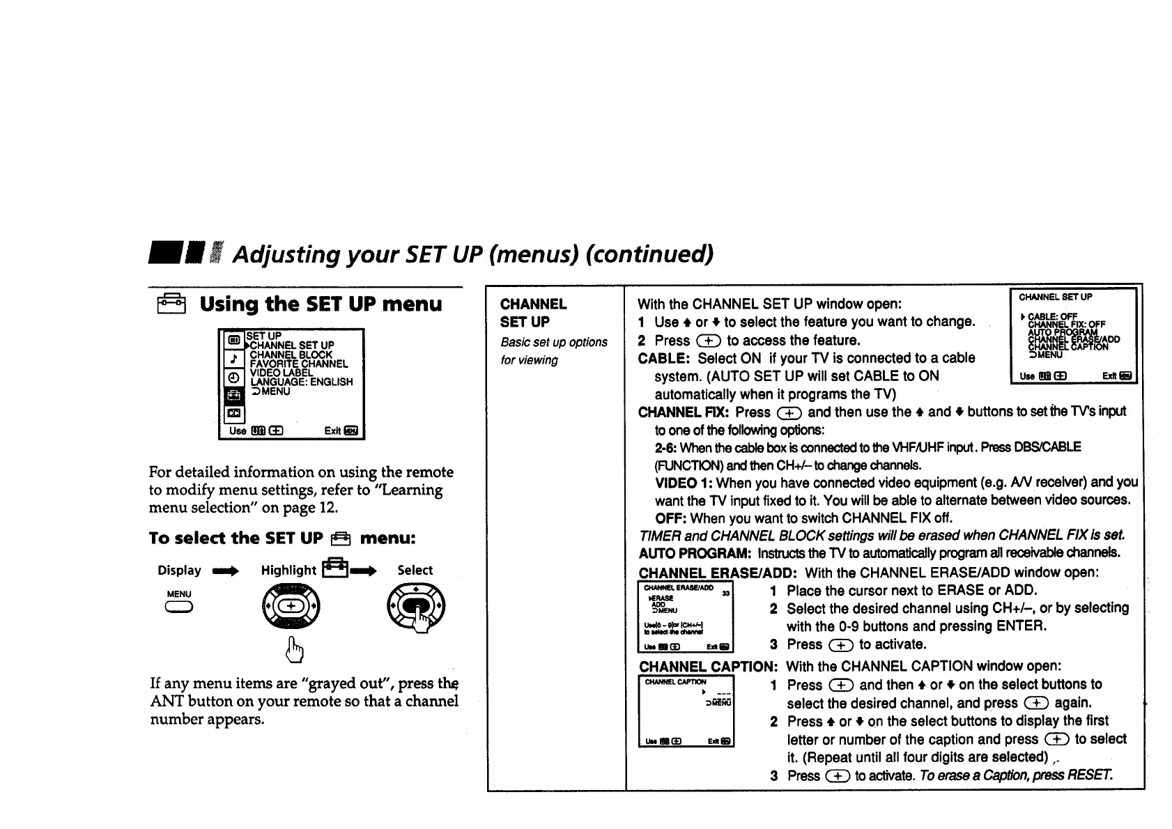iil Adjusting your SET UP (menus) (continued)