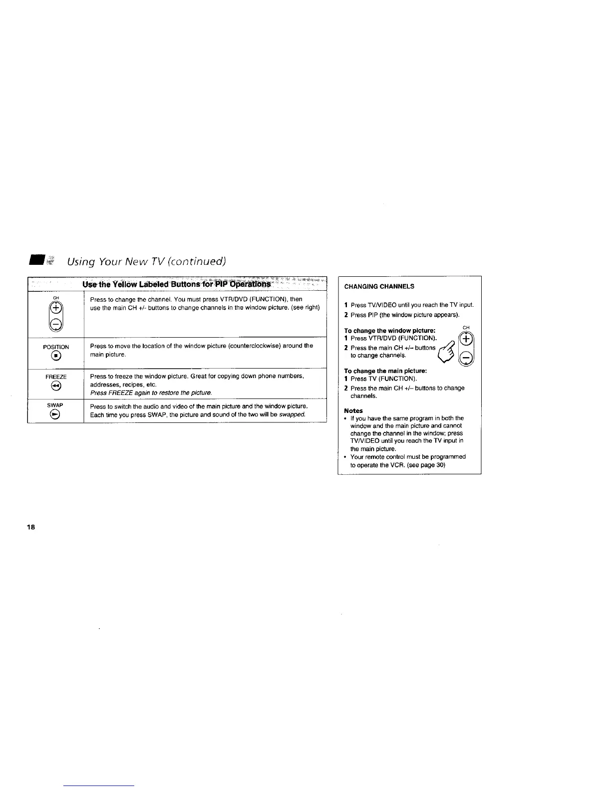 use the main CH +/- buttons to change channels in the window picture. (see right)