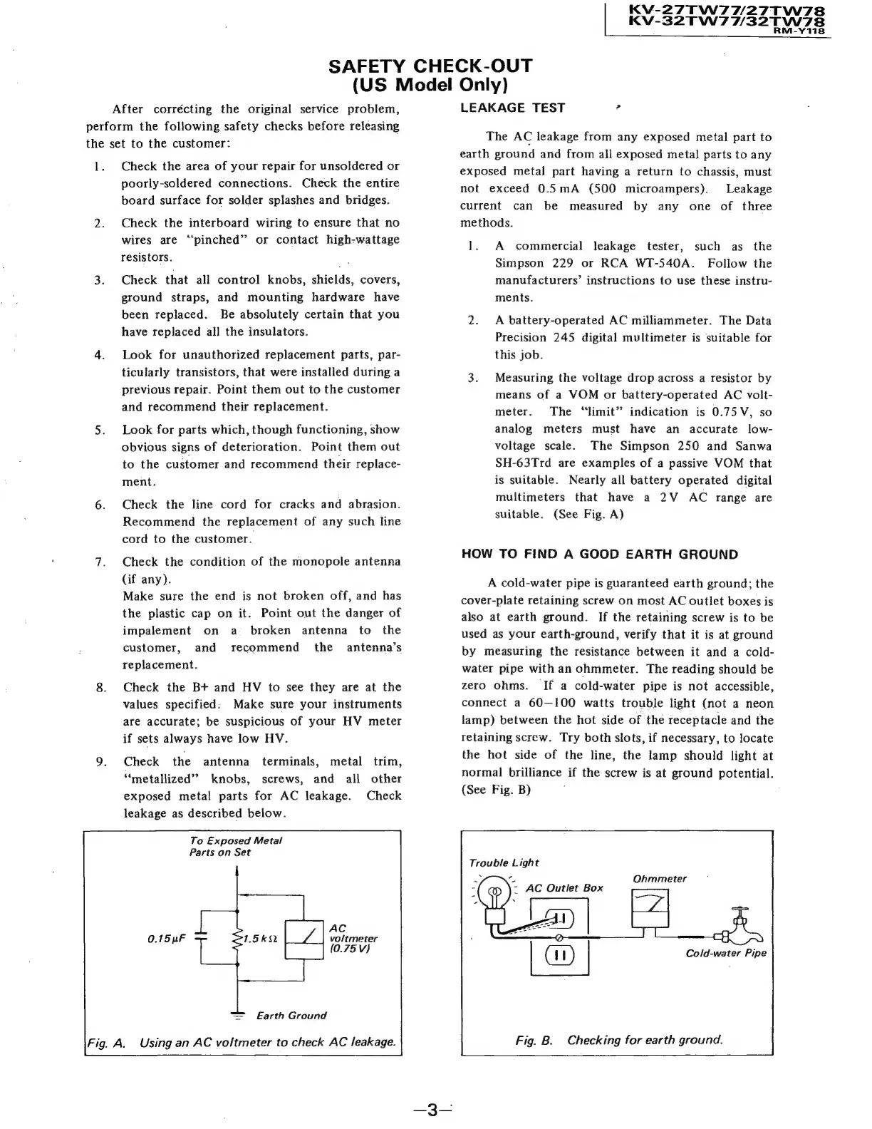 Sony Trinitron KV-32TW77 - Safety Check-Out Procedures; AC Leakage Testing; Establishing Earth Ground Connection