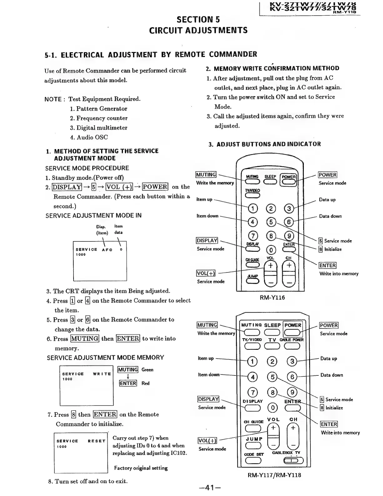 Sony Trinitron KV-32TW77 - Circuit Adjustments; Electrical Adjustment via Remote Commander