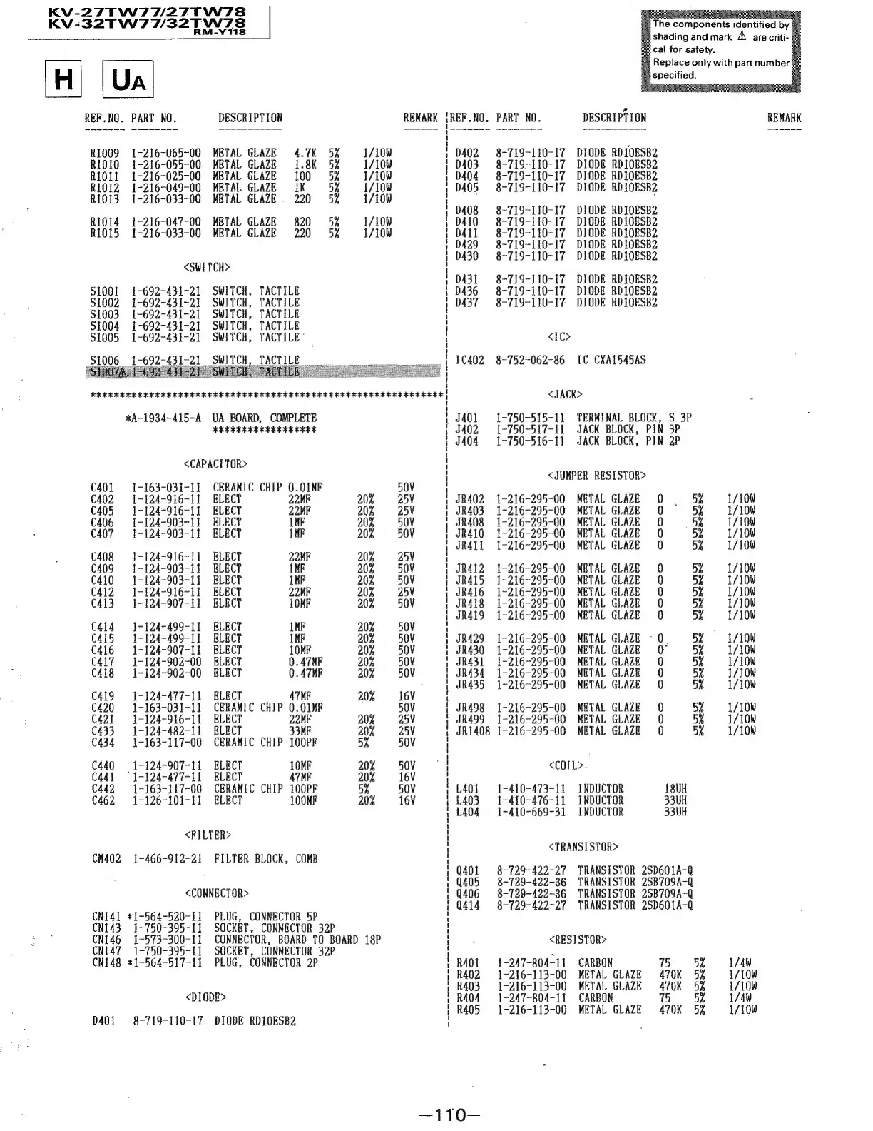 Sony Trinitron KV-32TW77 - Electrical Parts List Continuation (Resistors, Switches, ICs, etc.)