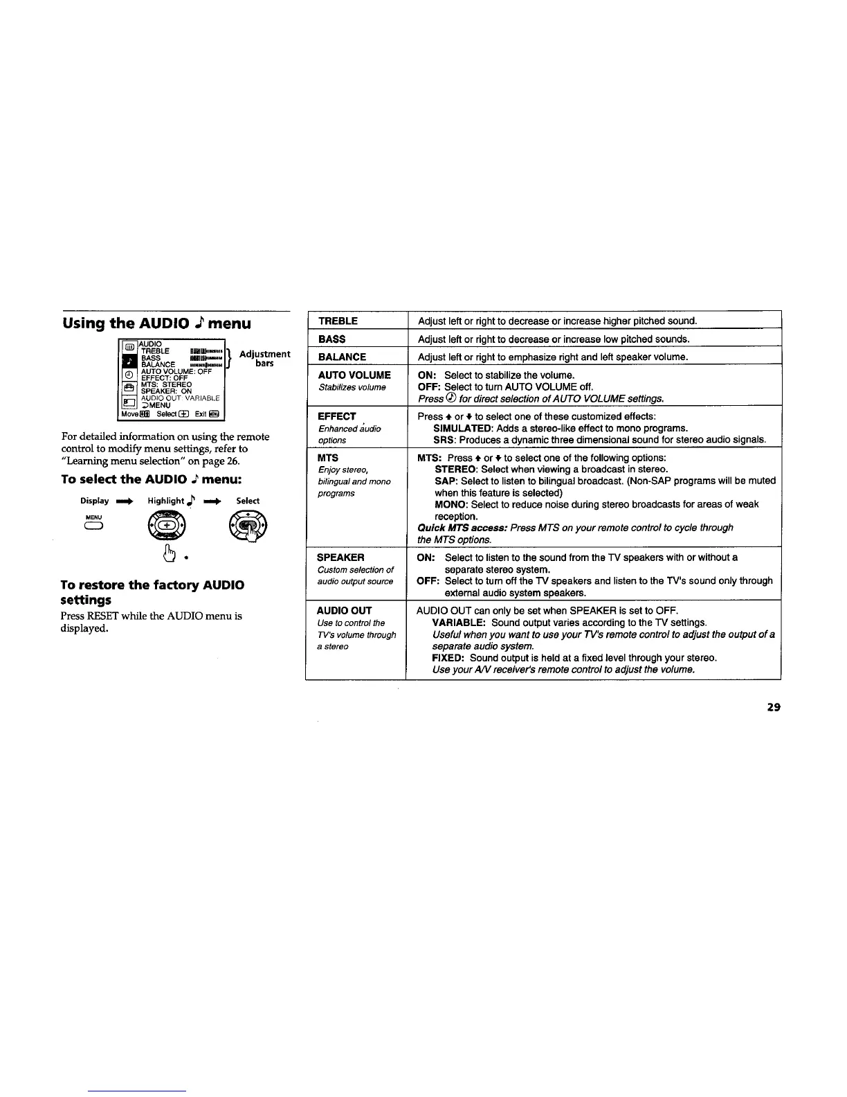 OFF: Select to turnoff the "IV speakers and listen to the TV's sound onlythrough