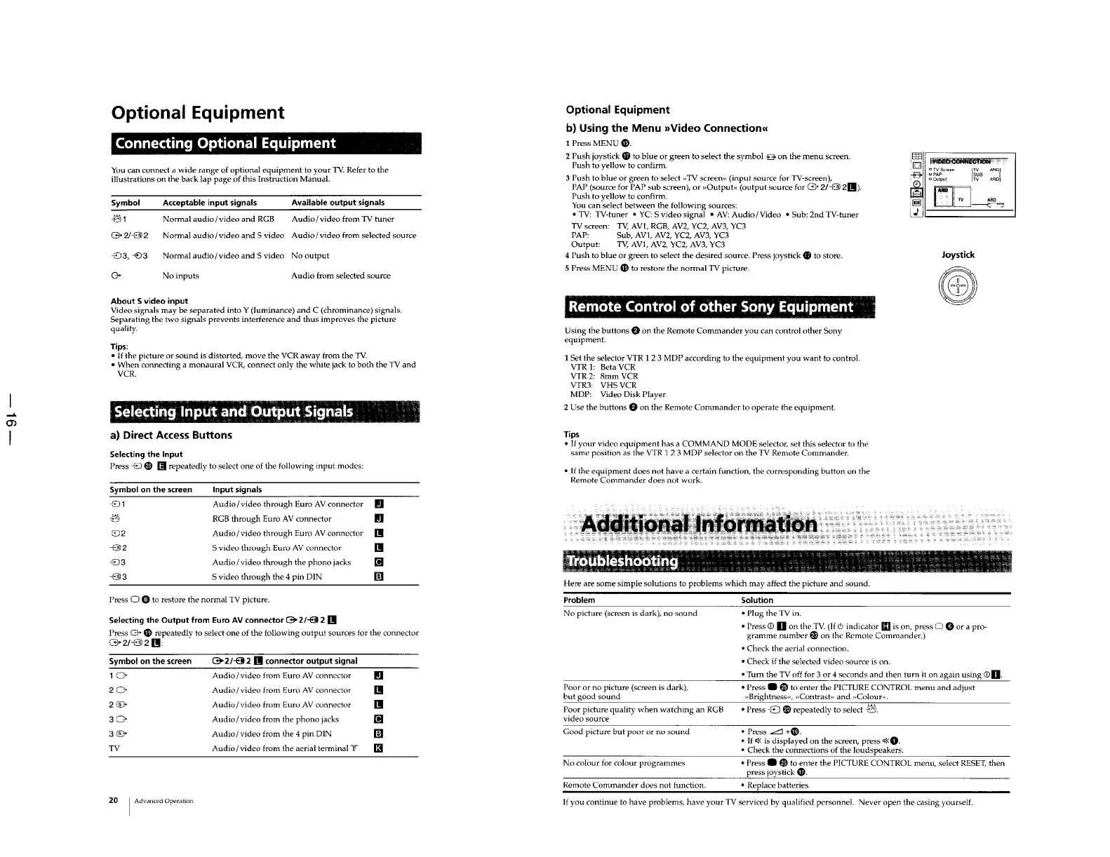 Sony TRINITRON KV-32WS4A - Optional Equipment and Information; Connecting Optional Equipment; Input;Output Signal Selection; Troubleshooting Common Issues