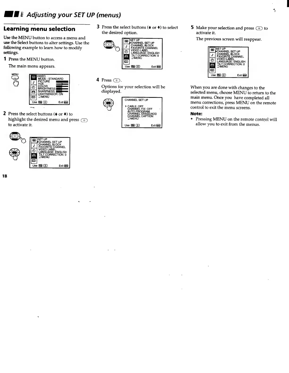 Sony Trinitron KV-35S36 - Adjusting TV Settings (Menus); Learning Menu Navigation; Channel Setup Options; Channel Captioning