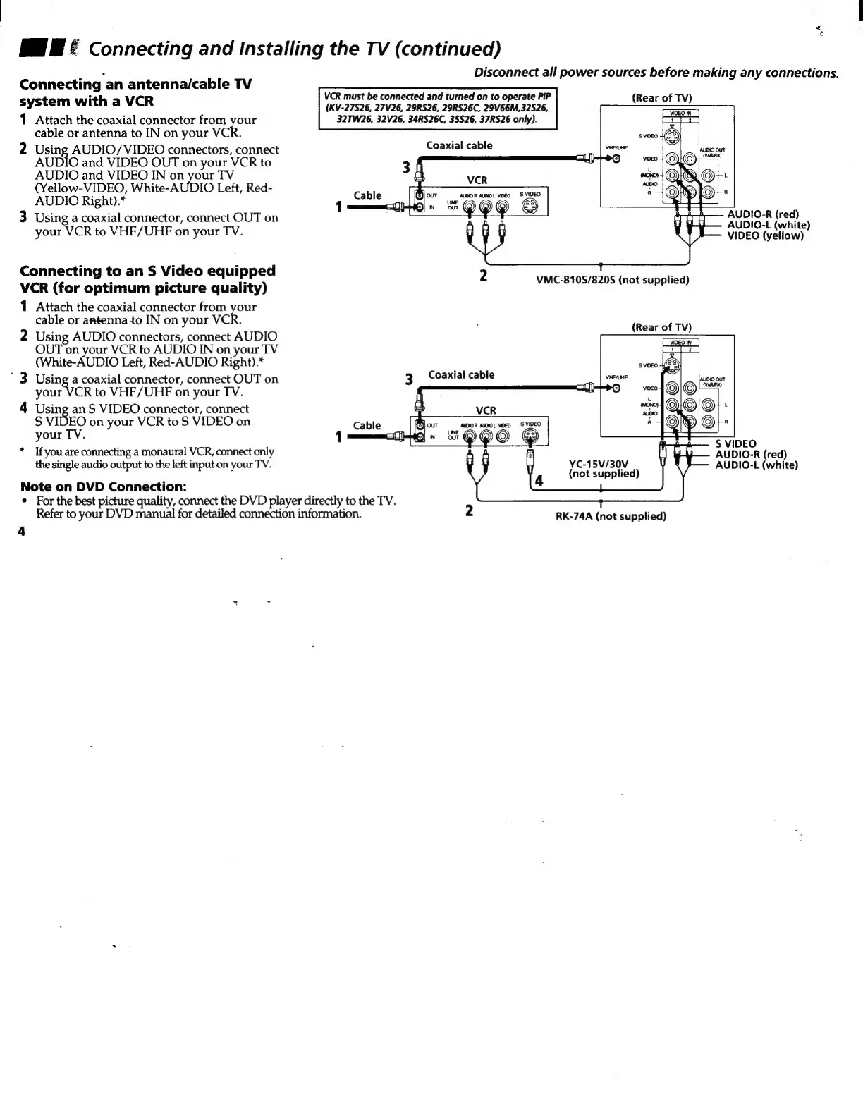 Sony Trinitron KV-35S36 - VCR and Component Connections; Antenna;Cable TV with VCR; S-Video VCR Connection