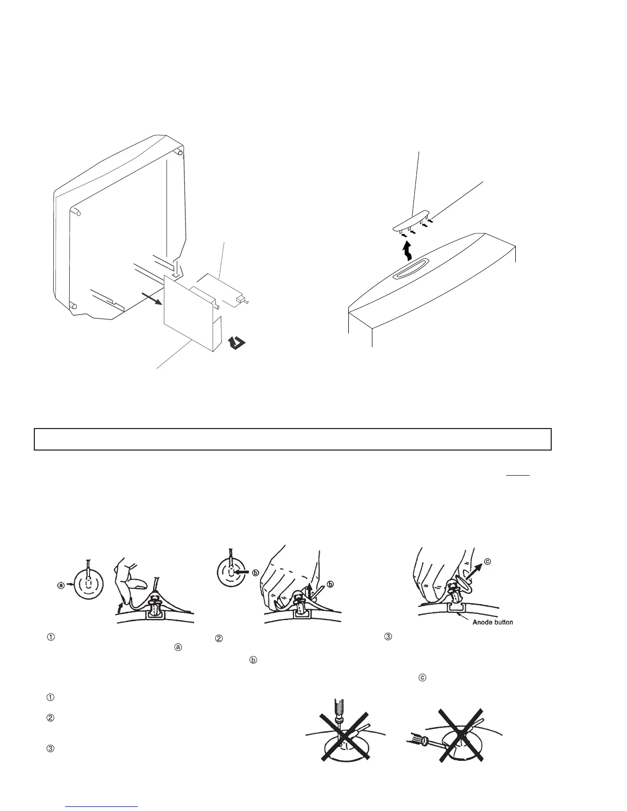 NOTE: After removing the anode, short circuit the anode of the picture tube and the anode cap to either the metal chassis, CRT shield