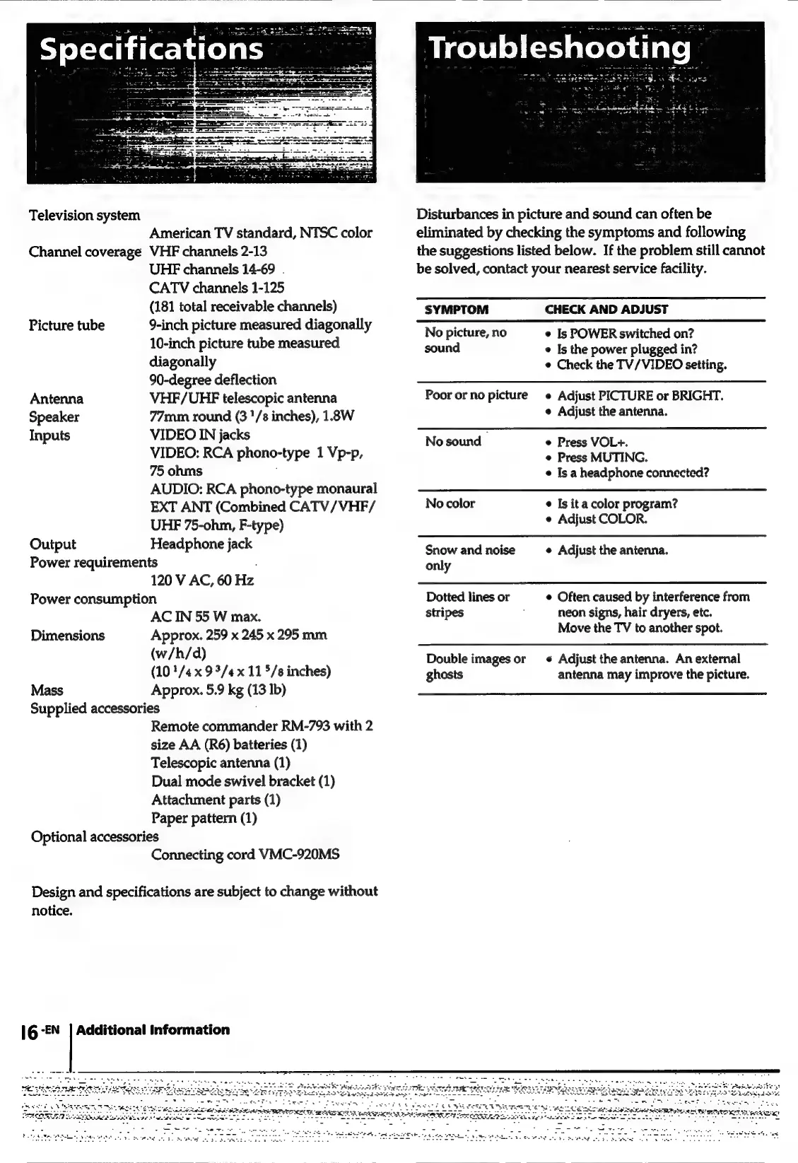Sony Trinitron KV-9PT40 - TV Specifications; Troubleshooting TV Issues
