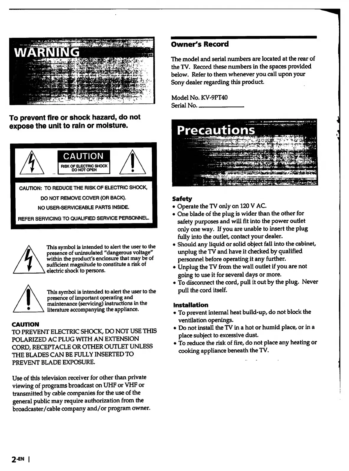 Sony Trinitron KV-9PT40 - Precautions; Safety Precautions; Installation Precautions