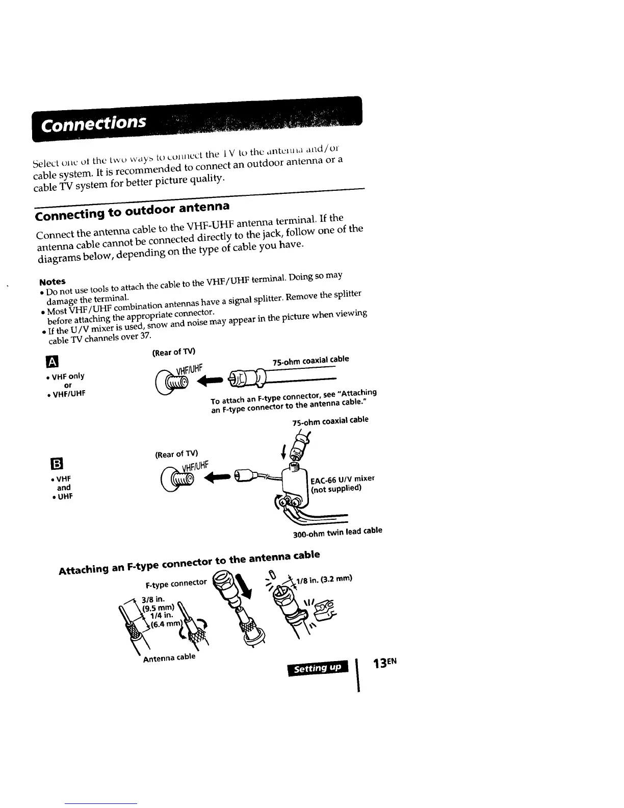 • Do not use tools to attach the cable to the VHF/UHF terminal. Doing so may