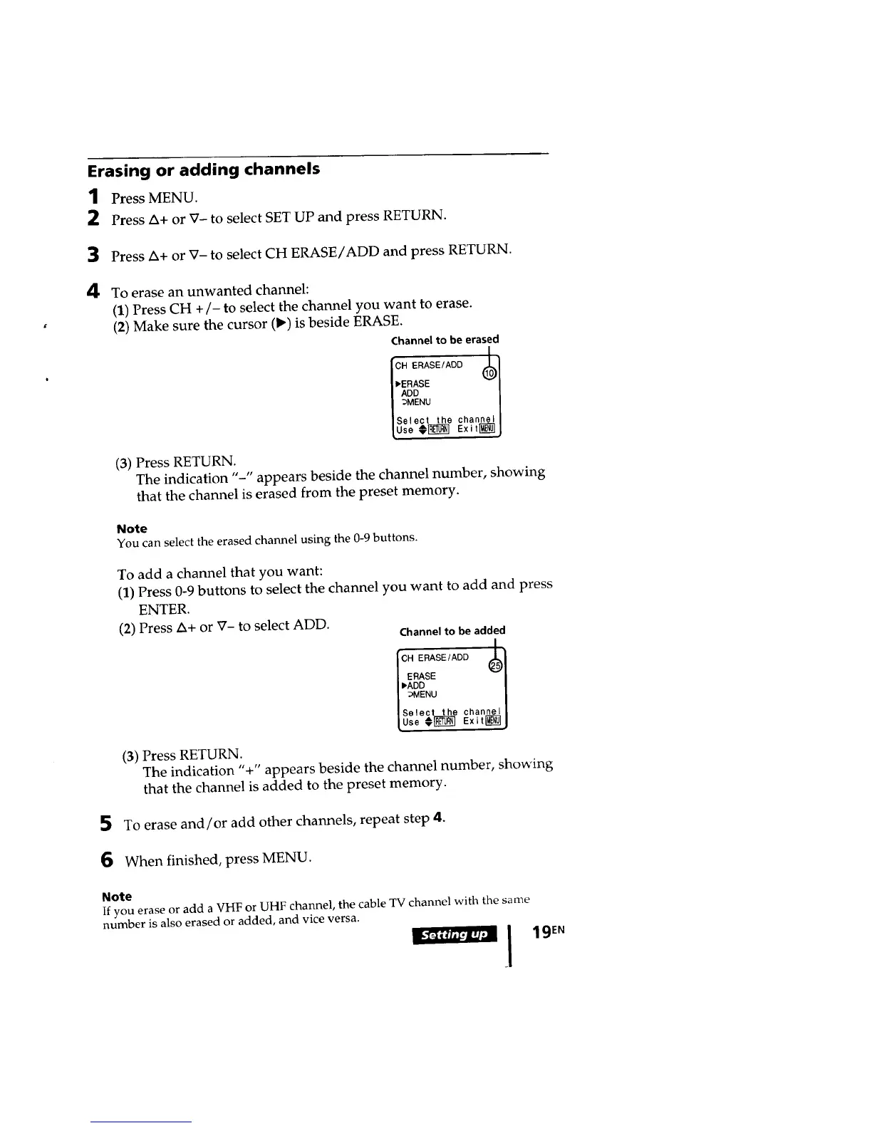 If you erase or add a VHF or UHF channel, the cable TV channel with the same