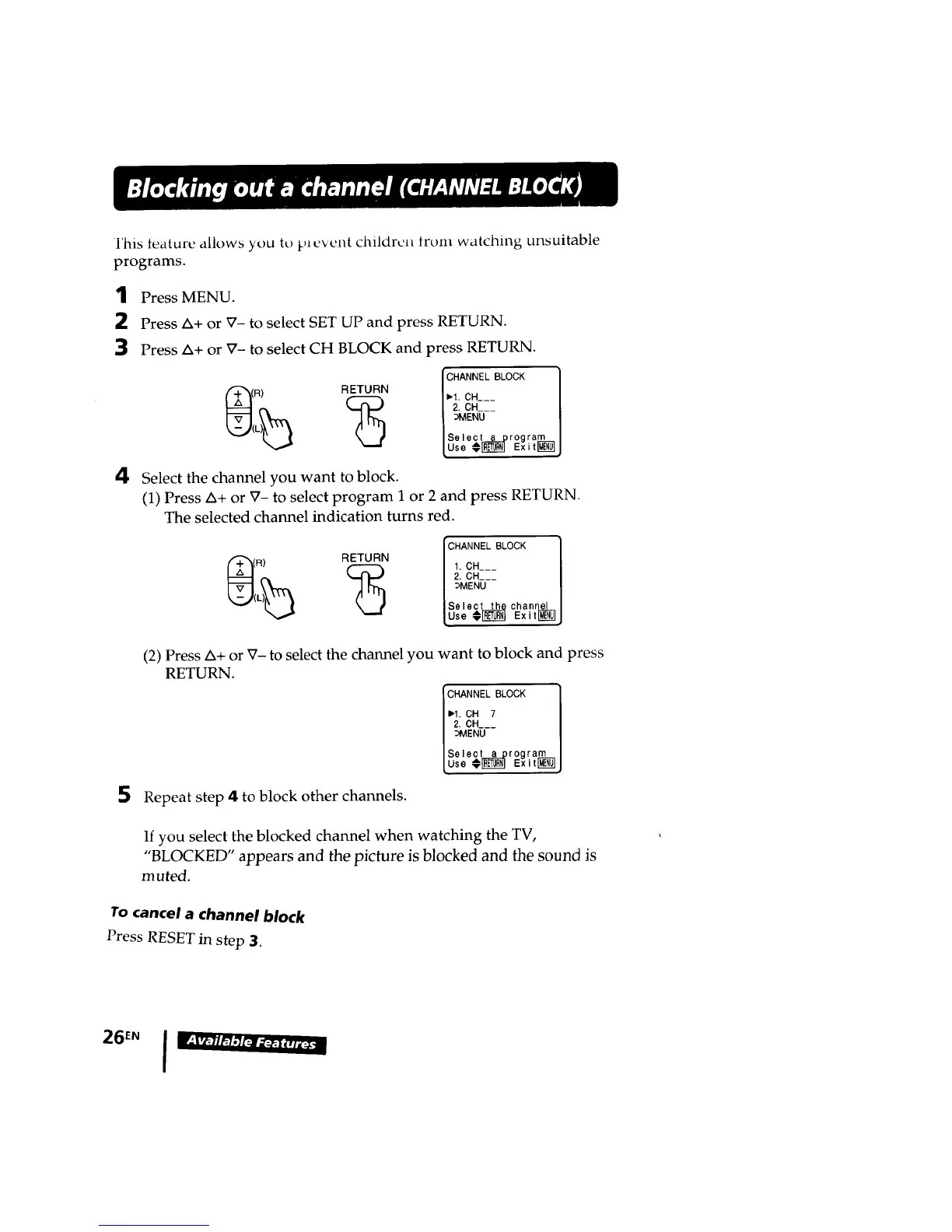 Press A+ or V- to select CH BLOCK and press RETURN.