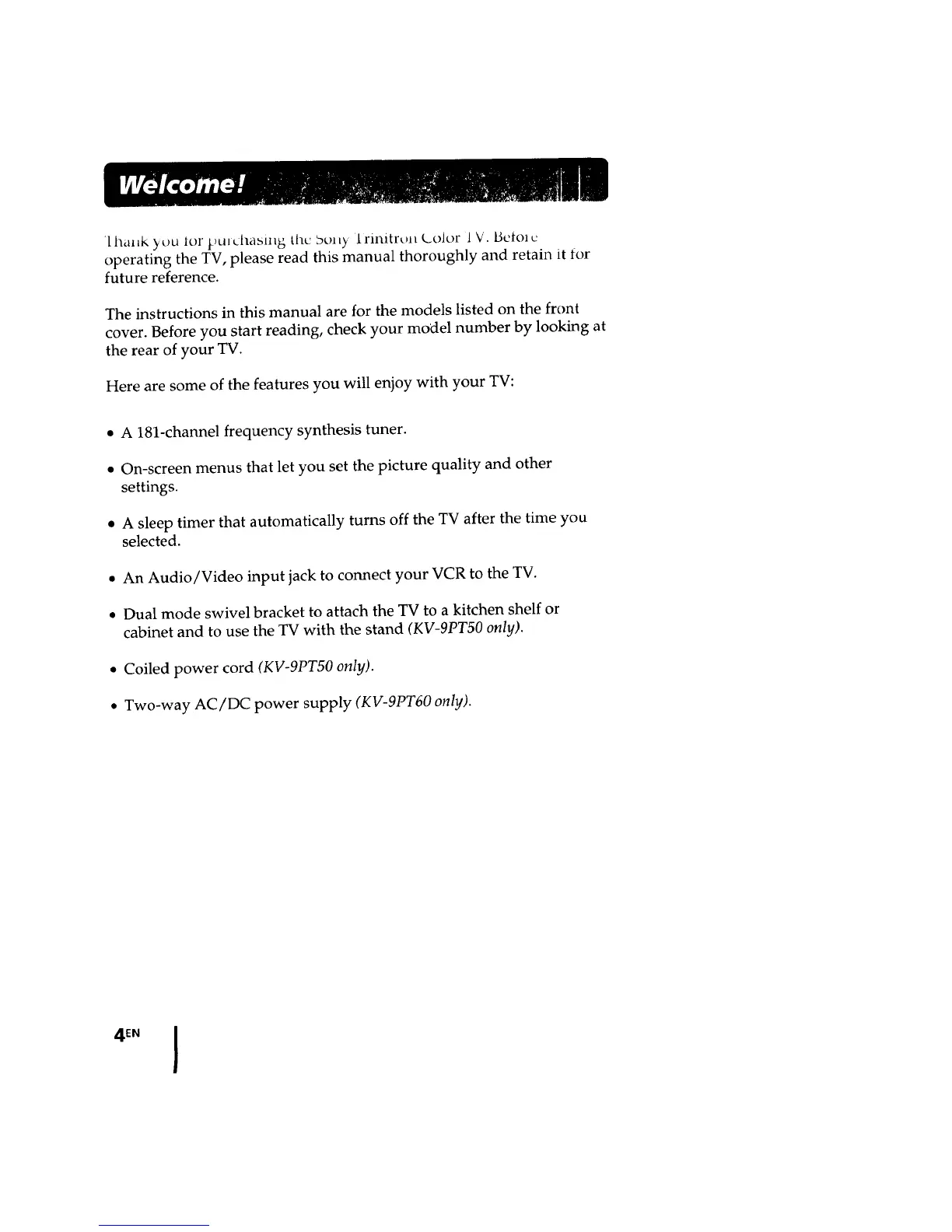 • Coiled power cord (KV-9PT50 only).