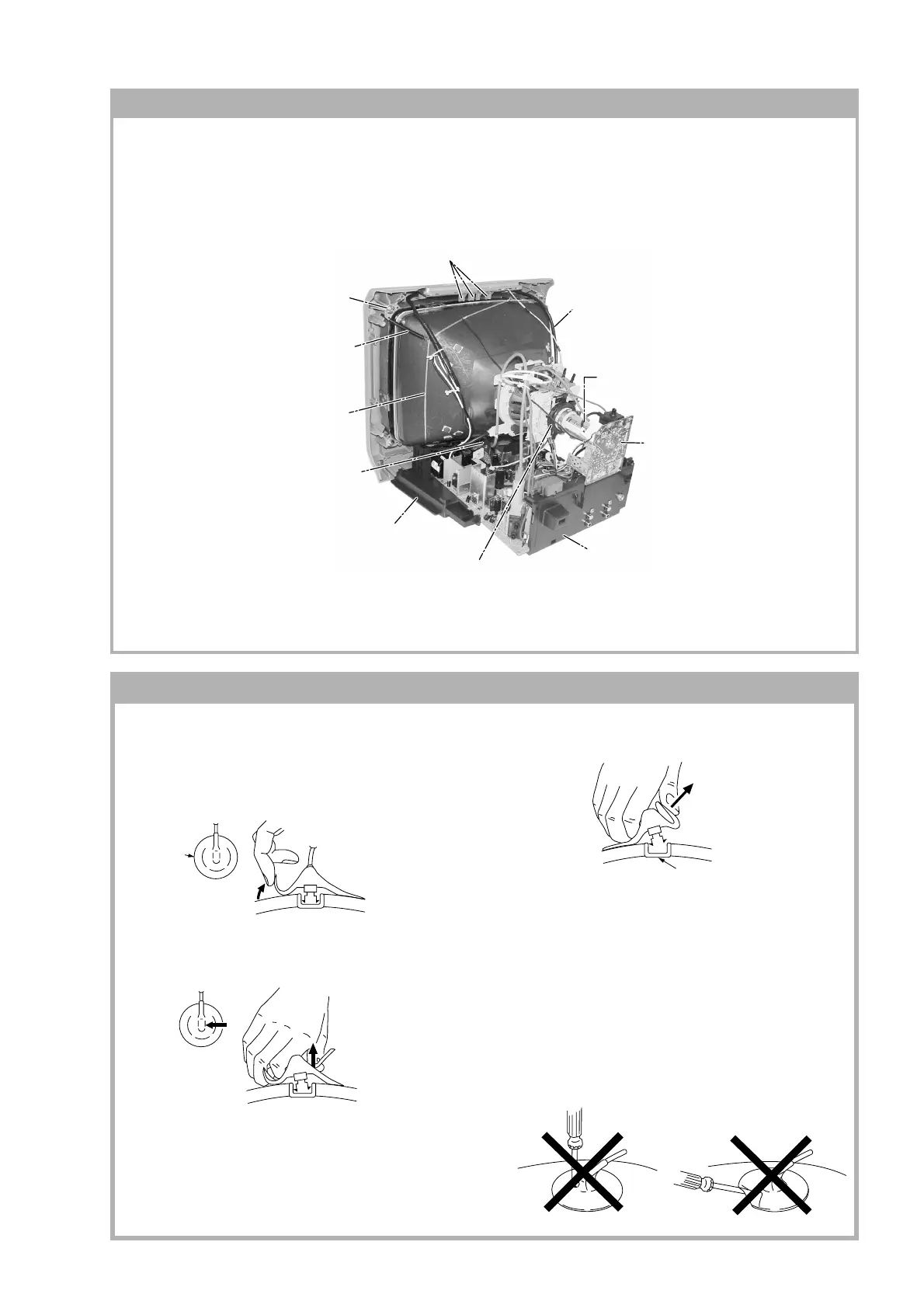 • After removing the anode, short circuit the anode of the picture tube and the anode cap to the metal chassis, CRT