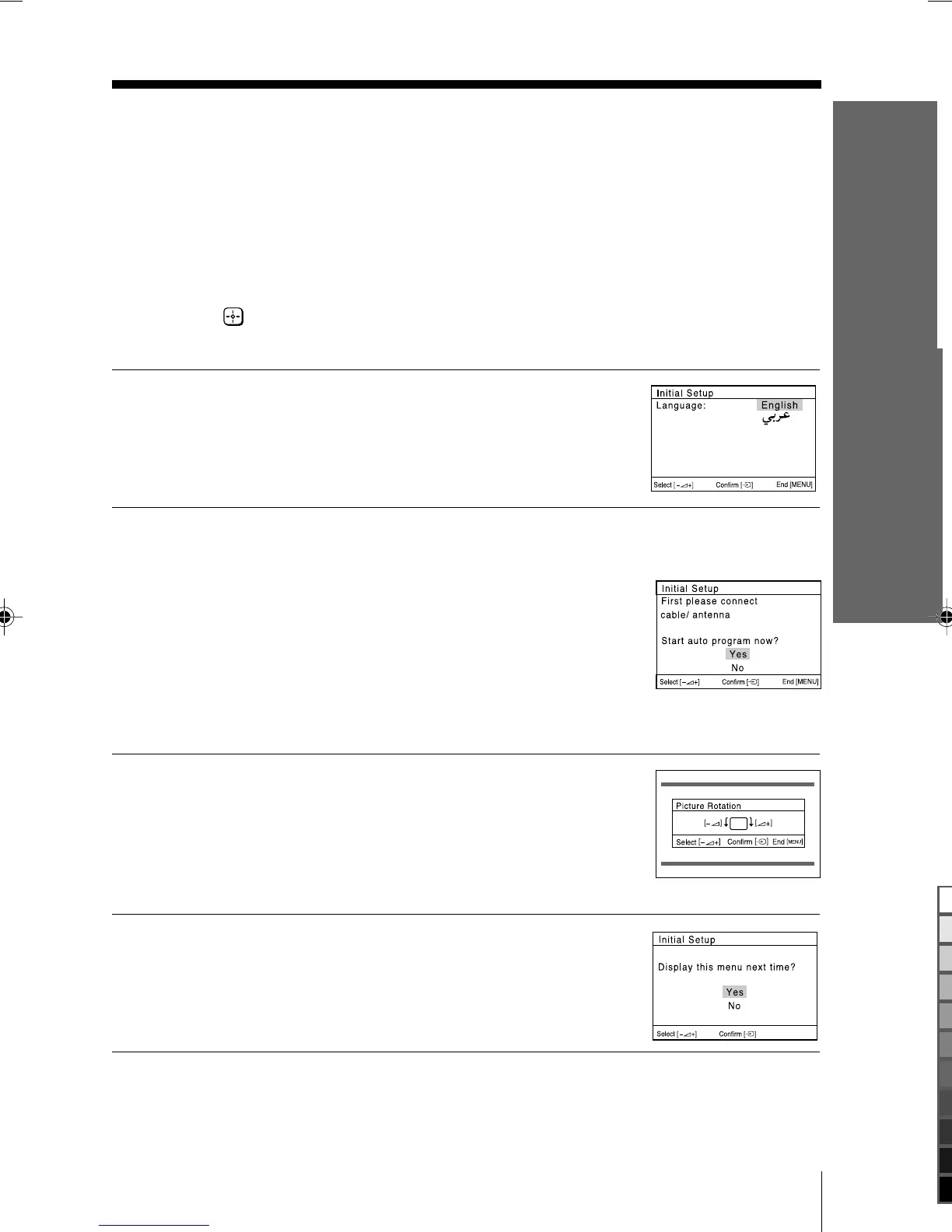 When you turn on your TV for the first time, the “Initial Setup” menu will appear.