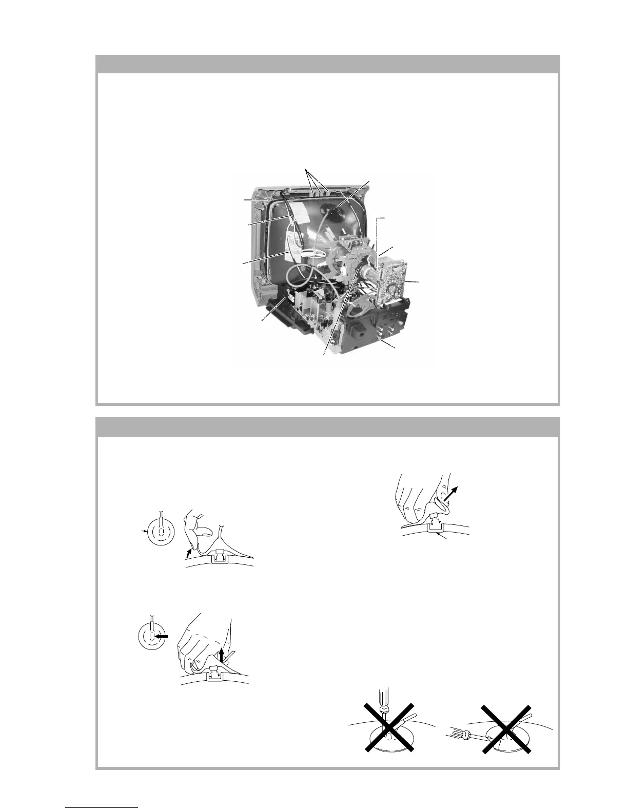 • After removing the anode, short circuit the anode of the picture tube and the anode cap to the metal chassis, CRT