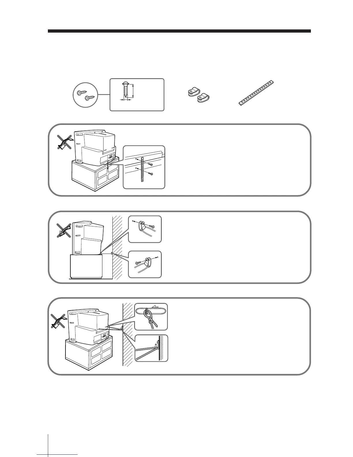To prevent the TV from falling, use the supplied screws, clamps and band to