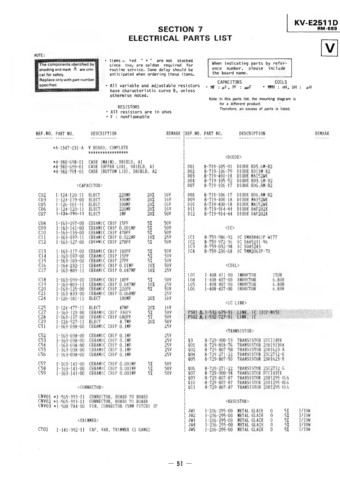 Sony TRINITRON KV-E2911D - Section 7 Electrical Parts List