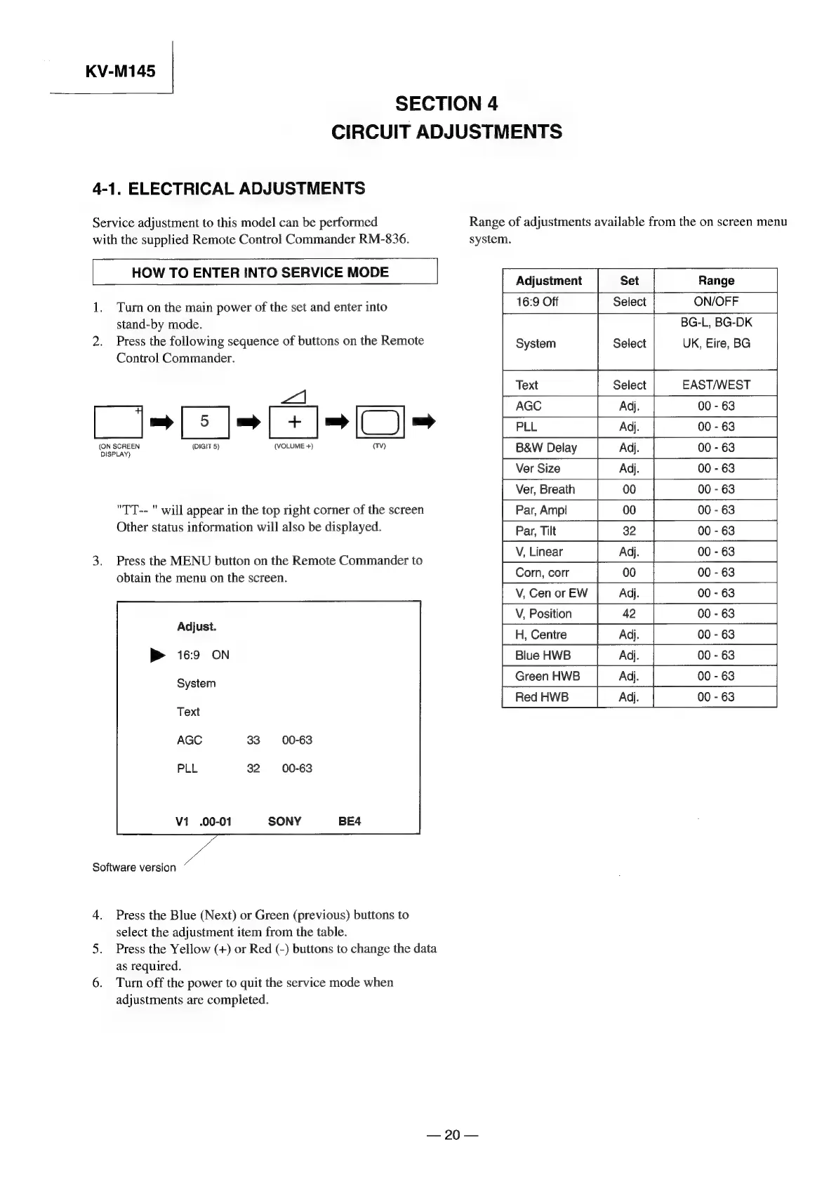 Sony TRINITRON KV-M1450E - Electrical Adjustments; Entering Service Mode; On-Screen Menu Adjustments