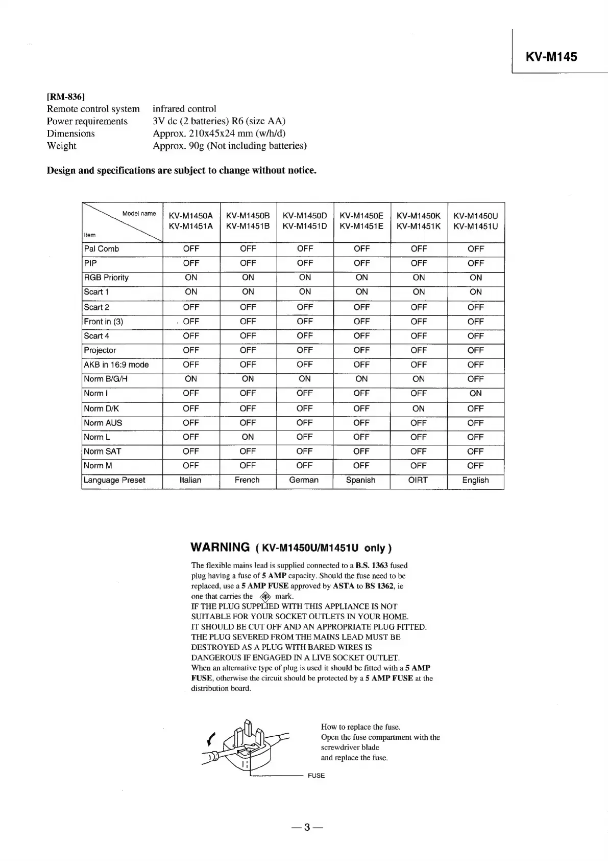 Sony TRINITRON KV-M1451D - Remote Control and Safety; Mains Lead and Plug Safety