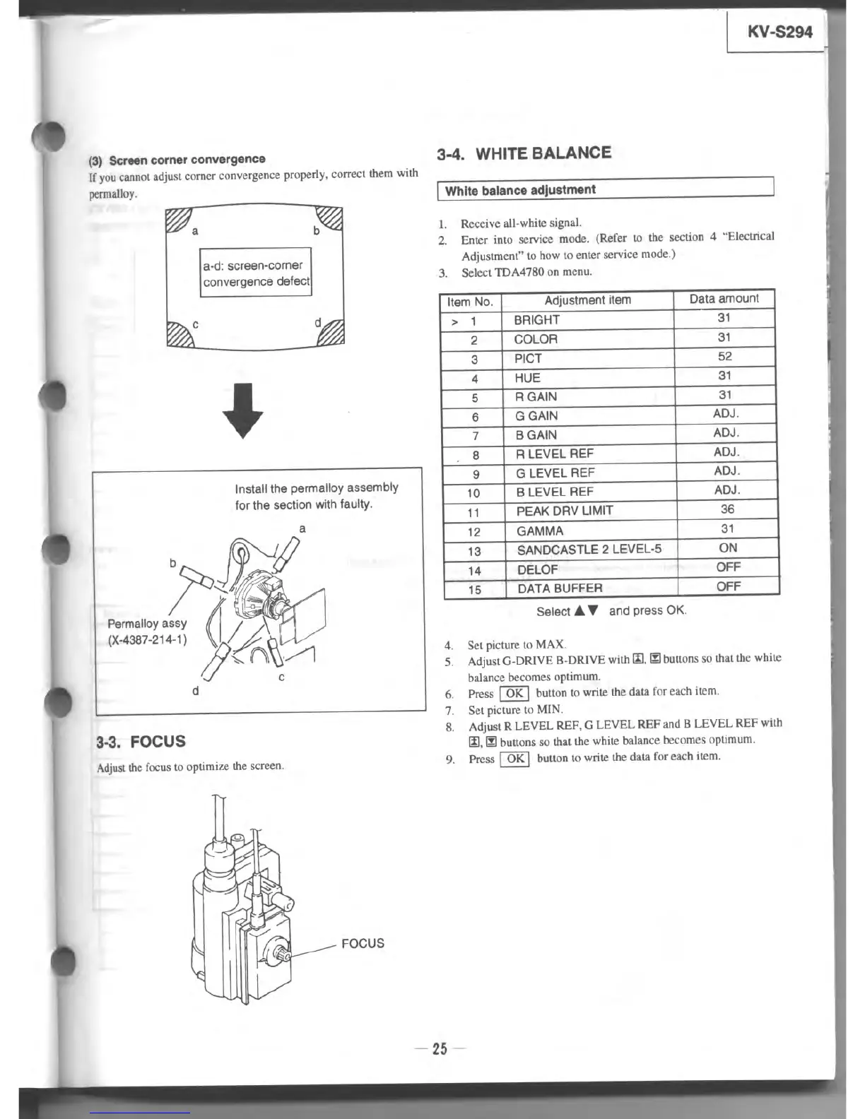 Sony Trinitron KV-S2941A - White Balance; Focus; White Balance Adjustment; Screen Corner Convergence