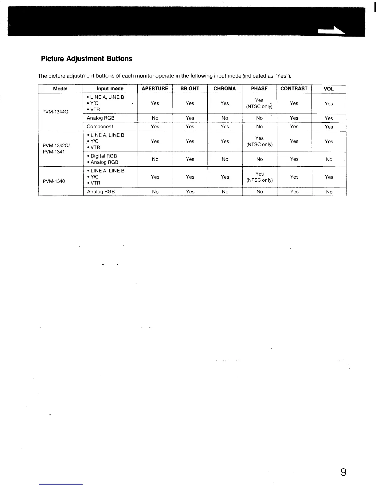 The picture adjustment buttons of each monitor operate in the following input mode (indicated as "Yes").