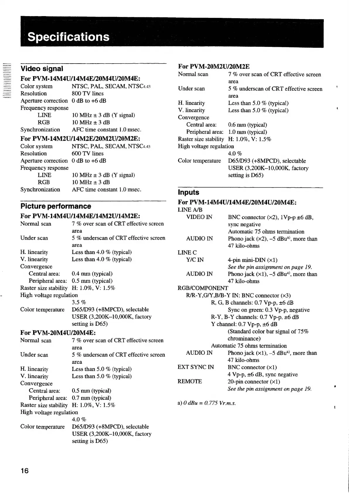 Sony Trinitron PVM-20M4U - Specifications; Video Signal Characteristics; Picture Performance Metrics; Input Signal Specifications
