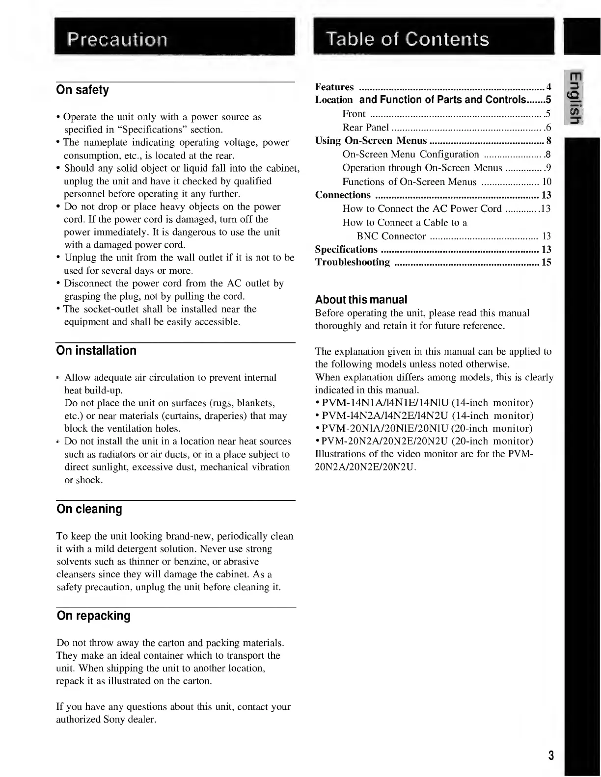 Sony TRINITRON PVM-20N1E - Table of Contents
