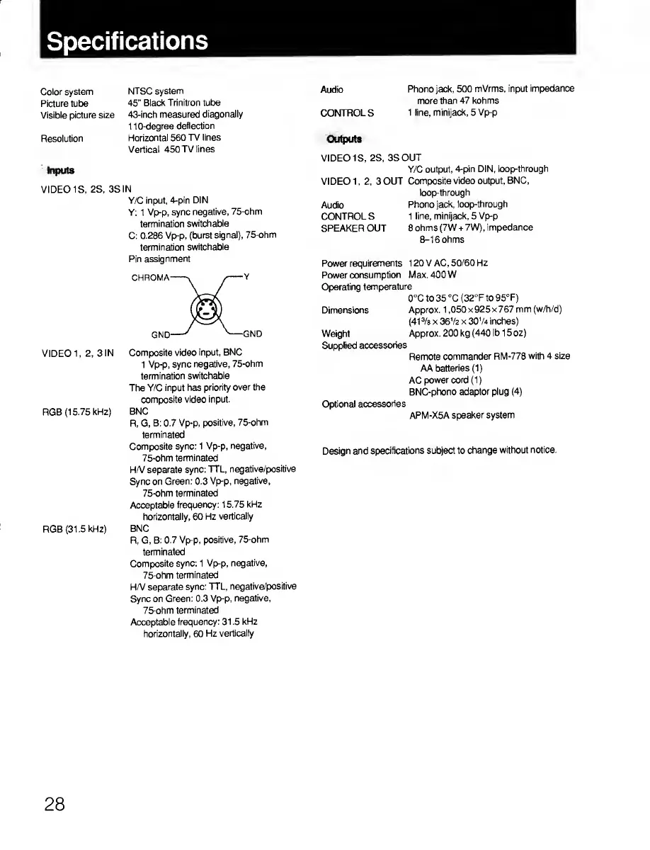 Sony Trinitron PVM-4300 - Technical Specifications; Input and Output Specifications; Power, Dimensions, and Weight; Supplied and Optional Accessories