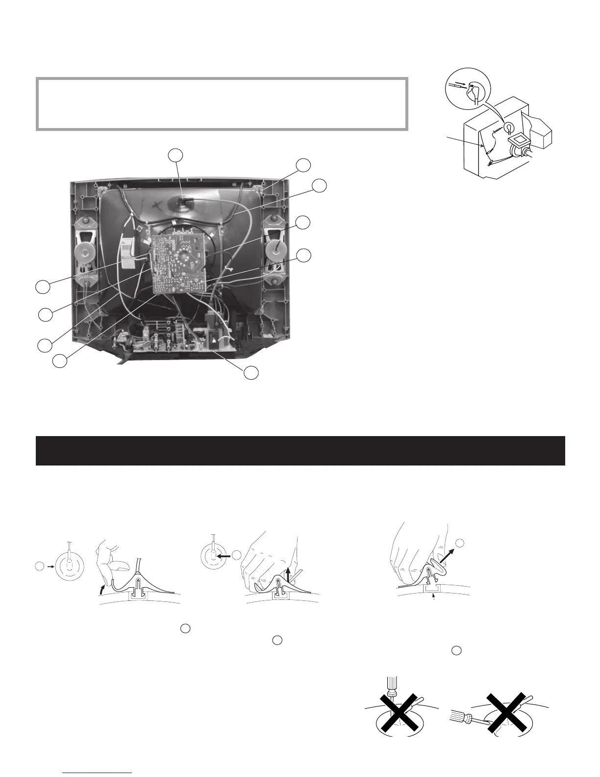 NOTE: After removing the anode cap, short circuit the anode of the picture tube and the anode cap to either the metal chassis, CRT shield, or carbon