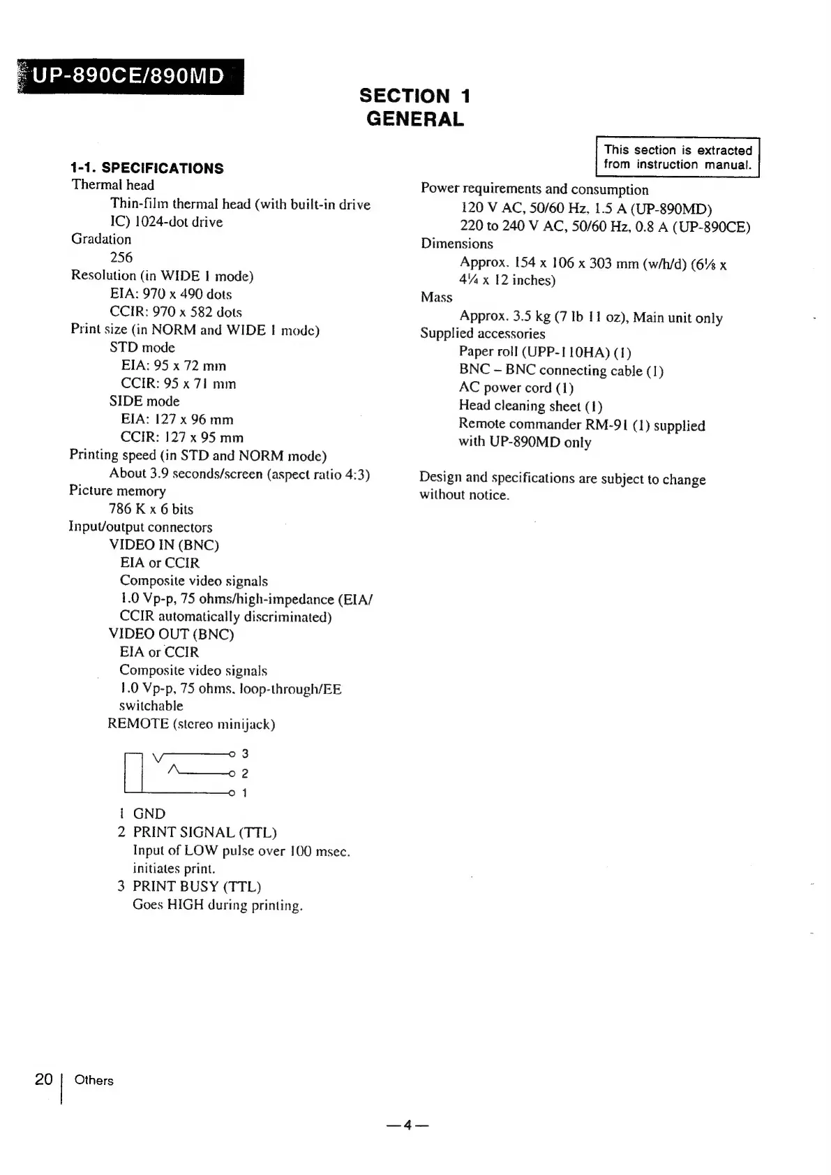 Sony UP-890MD - SECTION 1 GENERAL; 1-1. Specifications