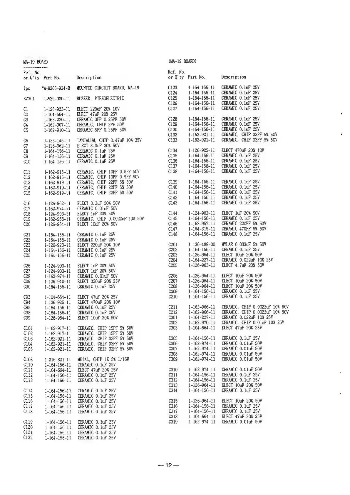Sony UP-890MD - MA-19 Board Parts List
