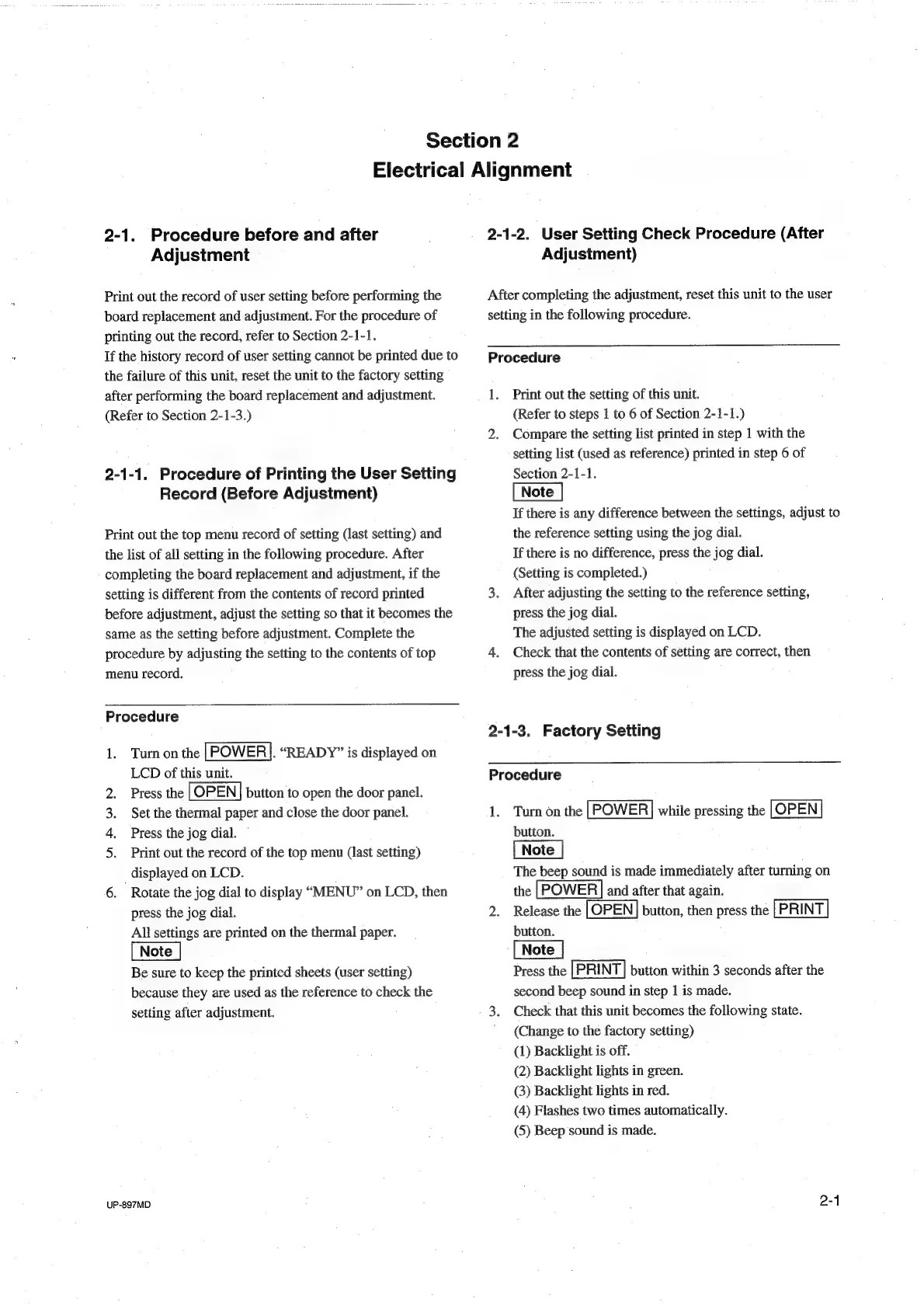Sony UP-897MD - Electrical Alignment; Adjustment Procedures and User Settings