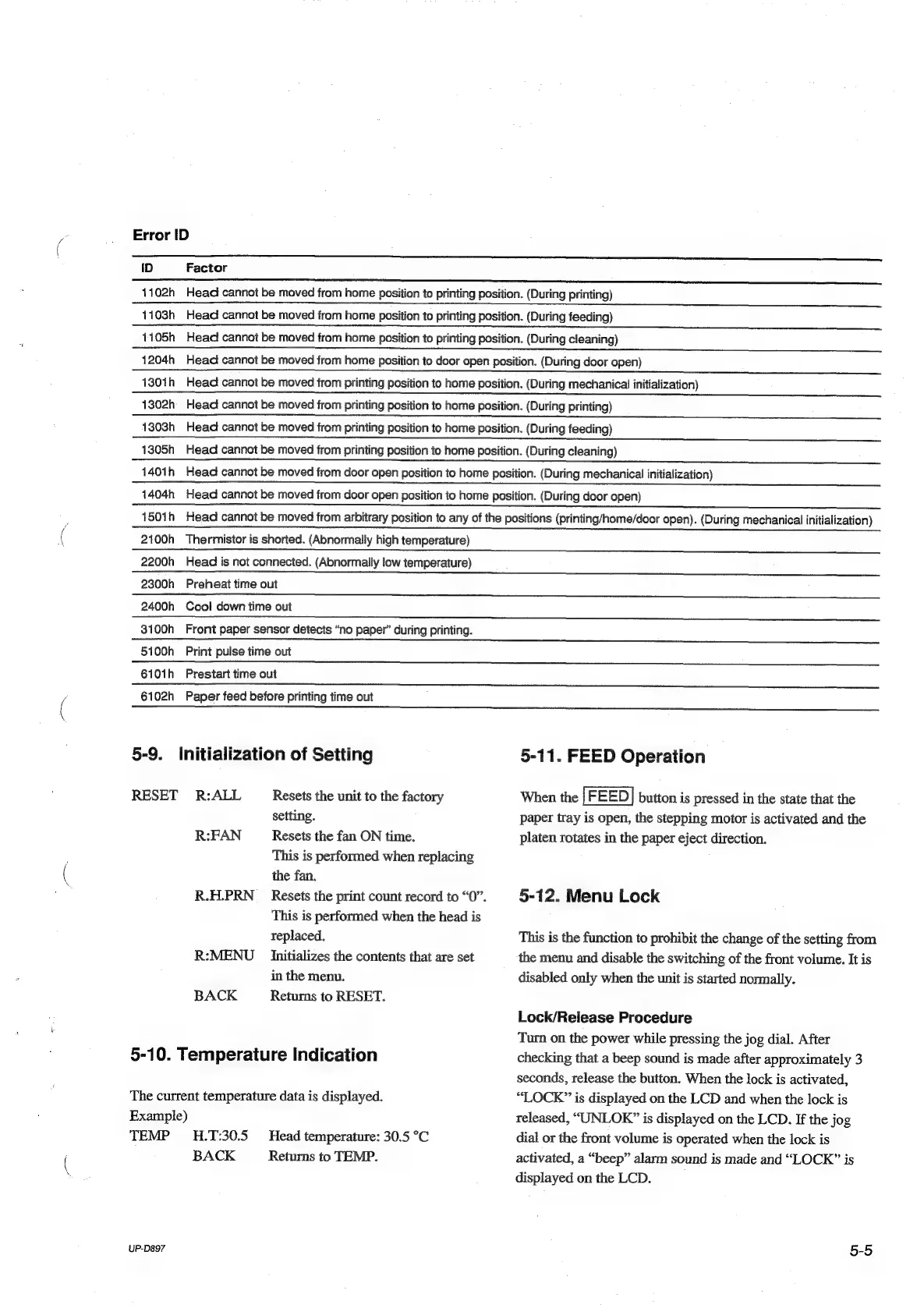 Sony UP-D897 - 5-9. Initialization of Setting; 5-10. Temperature Indication; 5-11. FEED Operation; 5-12. Menu Lock