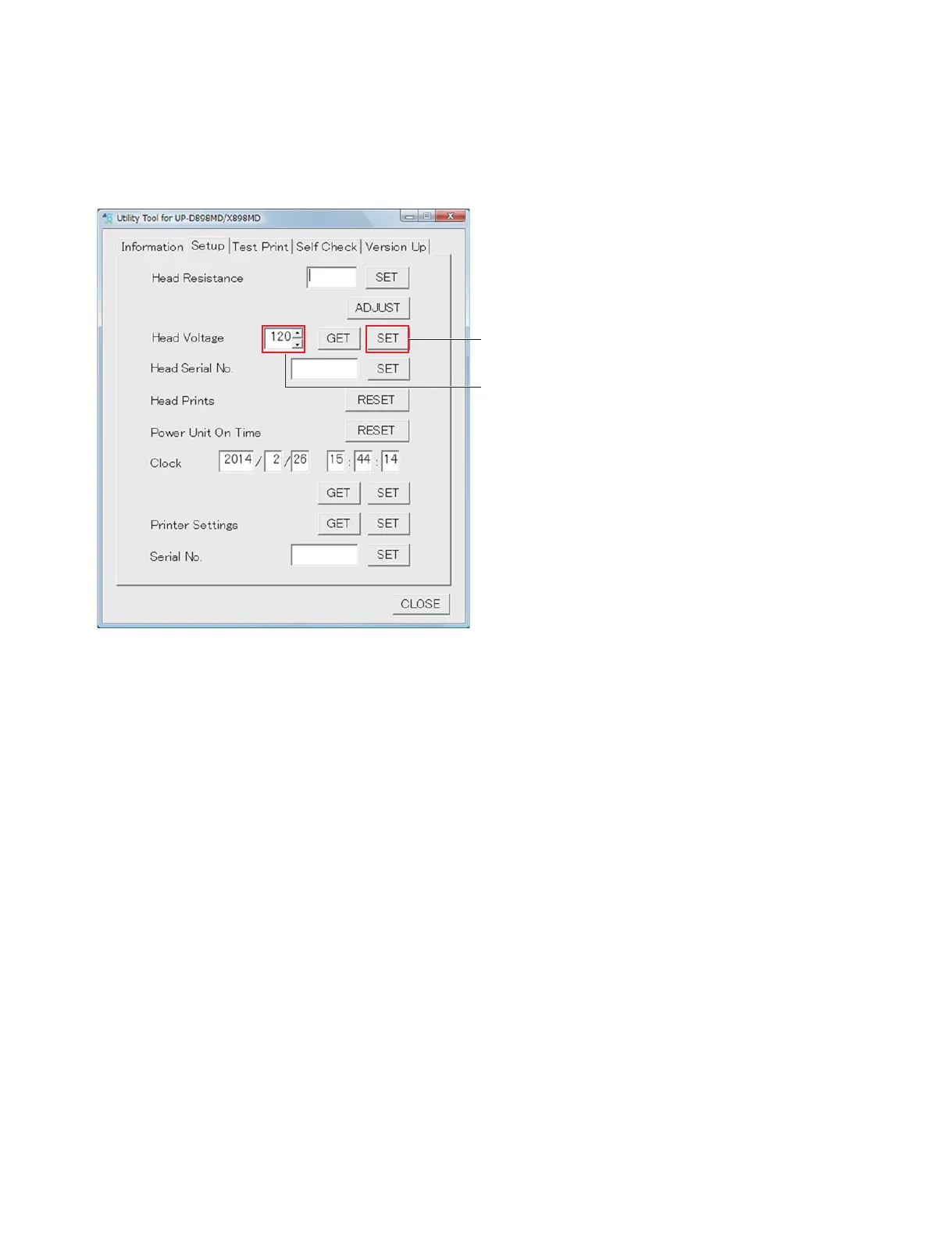 1. Type 120 in the edit box of “Head Voltage” of the Setup tab, and then click the [SET] button.