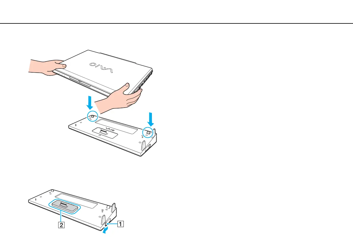 If an optional extended battery pack is attached to your computer, slide the tab (1) in the direction of the arrow to lift the connector (2) on the port