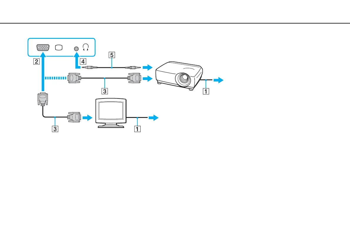 If necessary, connect the headphones jack on the projector and the headphones jack (4) i on the computer with a speaker cable (5).