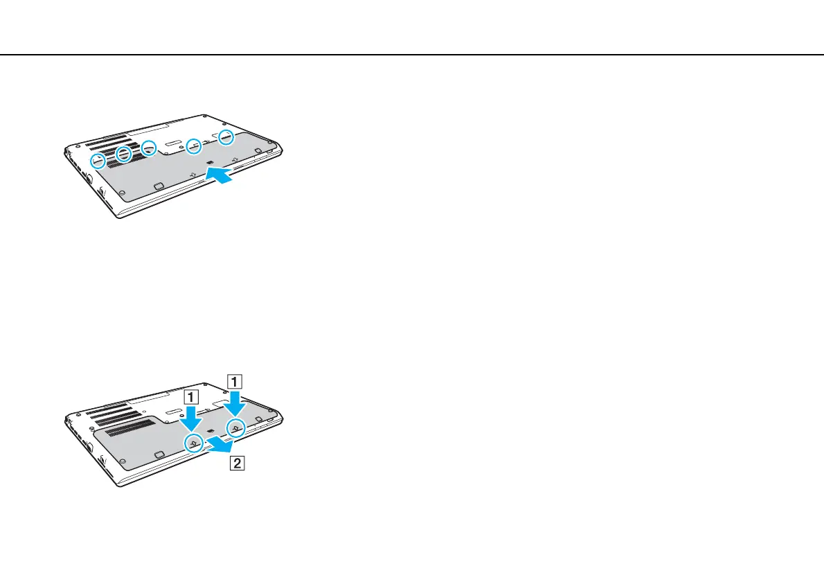 2 Unscrew the two screws (1), slide the bottom cover in the direction of the arrow (2), and remove the cover.