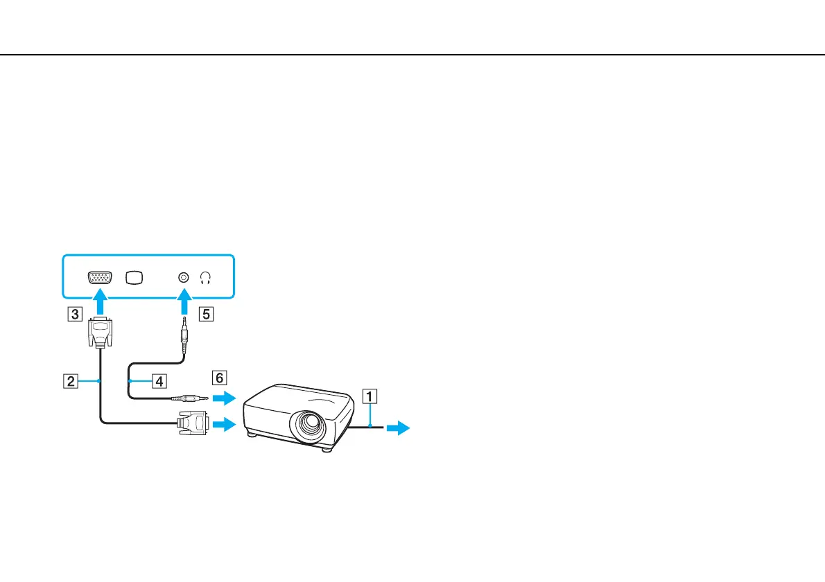 4 Plug the display cable and the audio cable into the port and jack on the projector (6).