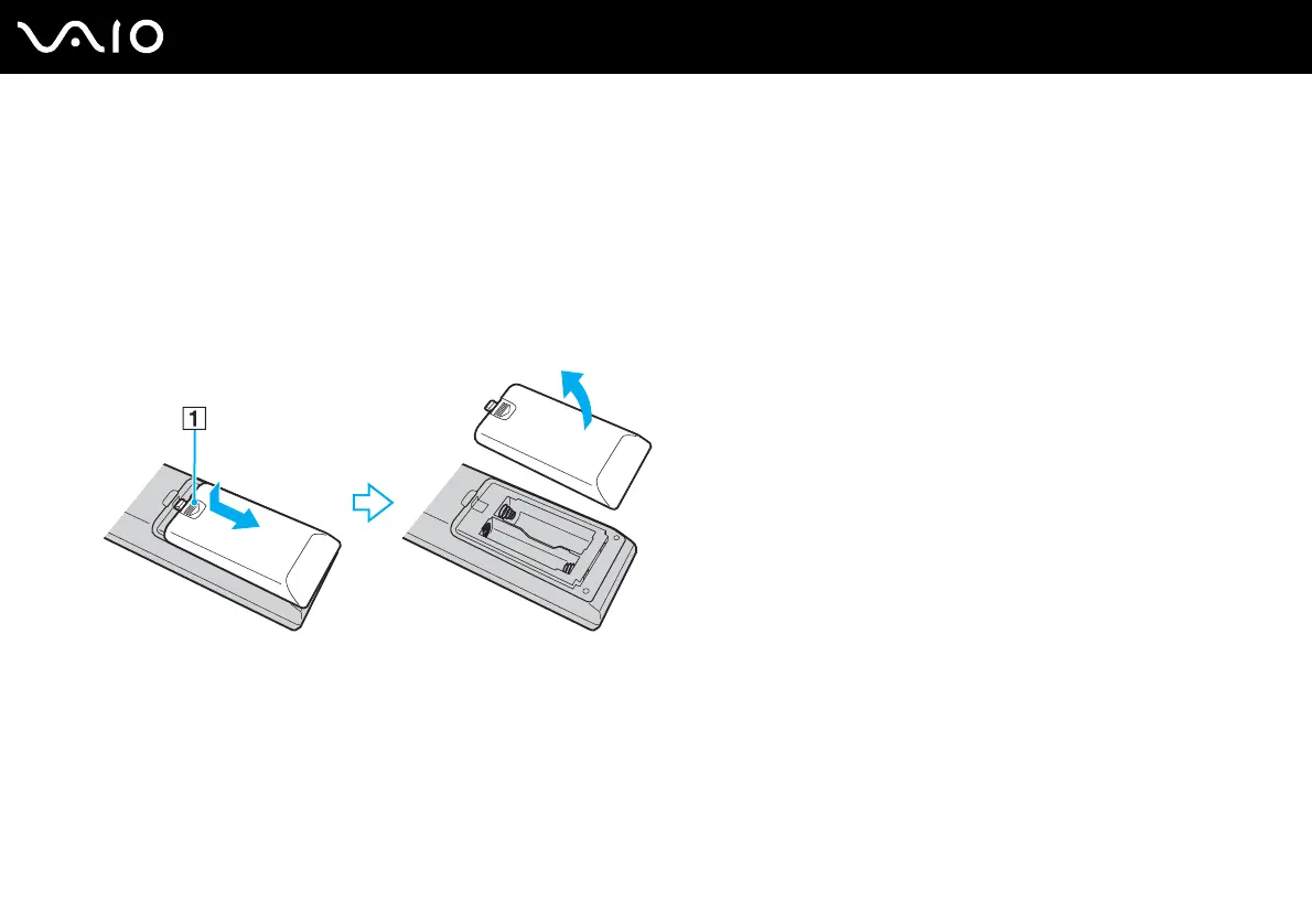 2 Slightly push down the dented area (1), slide the battery cover in the direction of the arrow, and remove the cover.