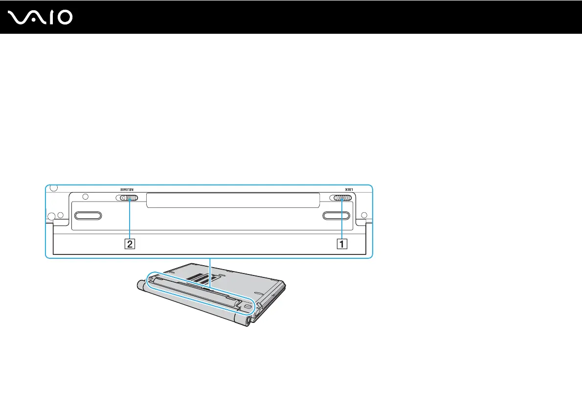 2 Slide the battery LOCK switch (1) inward and slide and hold the battery RELEASE latch (2) on the bottom of the