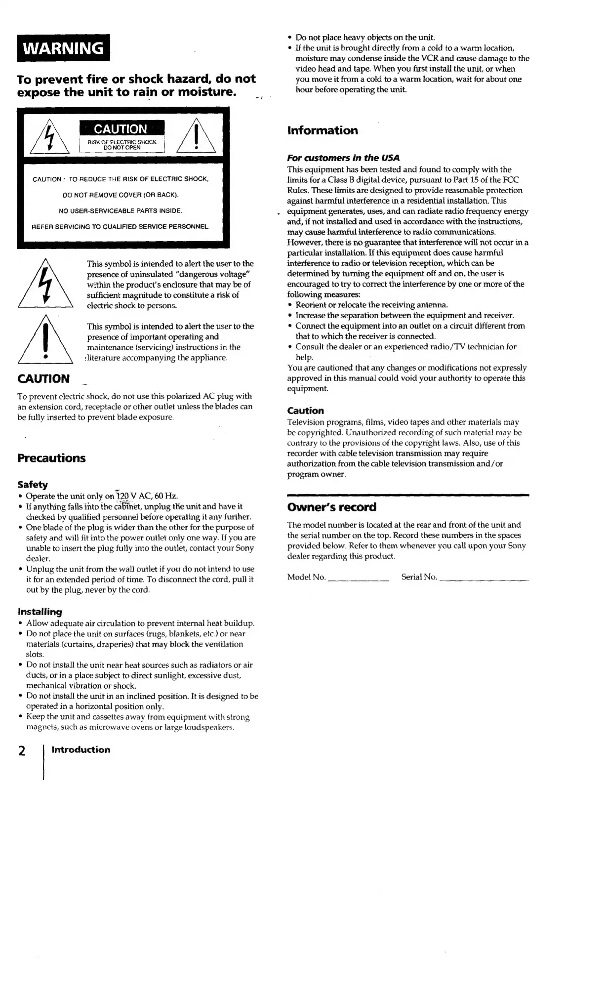 Sony Video8 EV-A60 - Introduction and Safety; Precautions; General Warnings