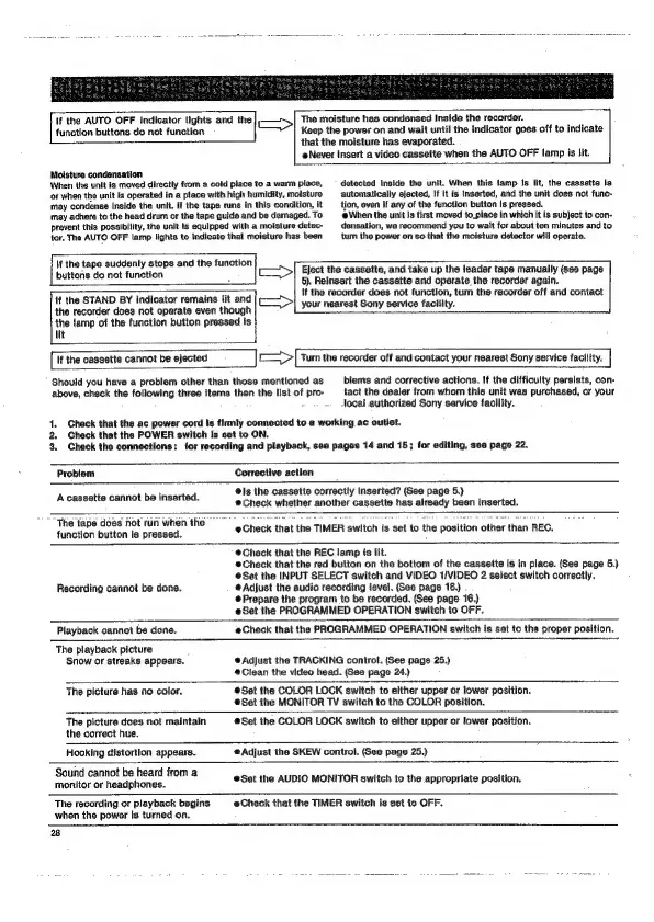 Sony VO-5800PS - Troubleshooting Guide; Moisture and Function Issues; Cassette and Tape Running Problems; Recording;Playback and Picture Issues