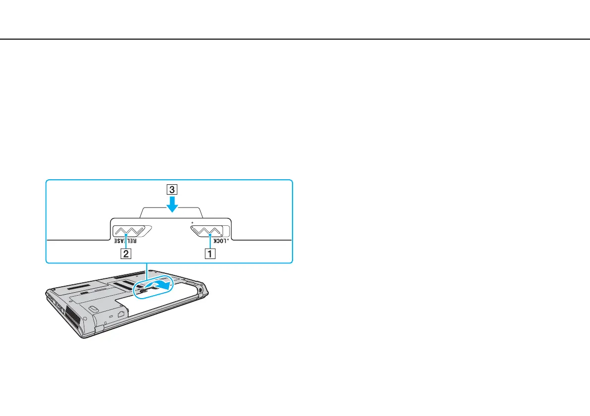 3 Slide and hold the battery RELEASE latch (2) inward, put your fingertip underneath the tab (3) on the battery pack, and