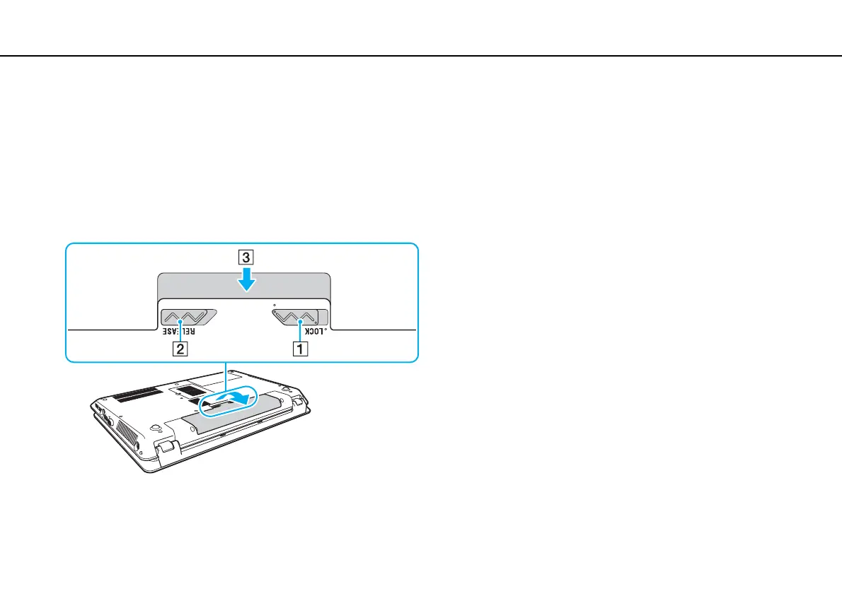 3 Slide and hold the battery RELEASE latch (2) inward, put your fingertip underneath the tab (3) on the battery pack, and