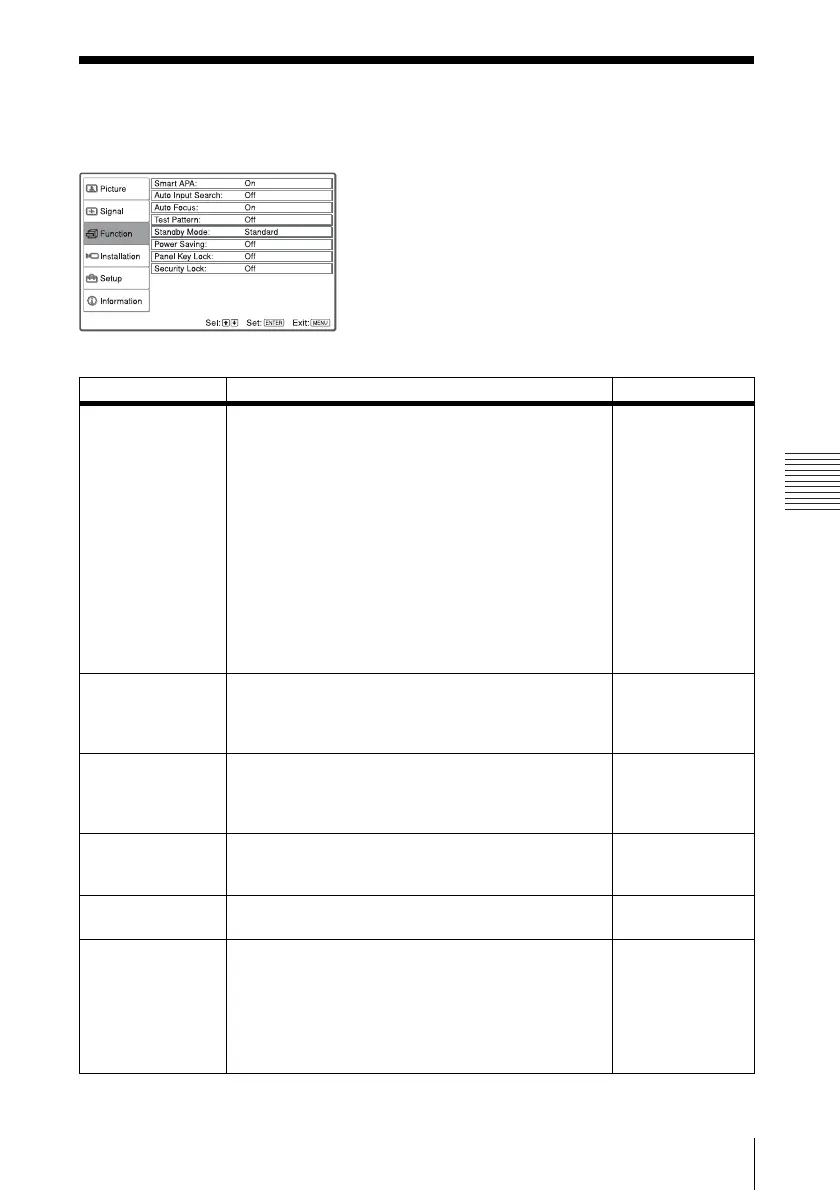 The Function menu is used for changing the settings of the projector.