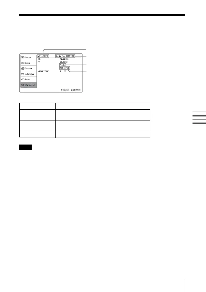 The Information menu displays the model name, serial number, the horizontal and vertical