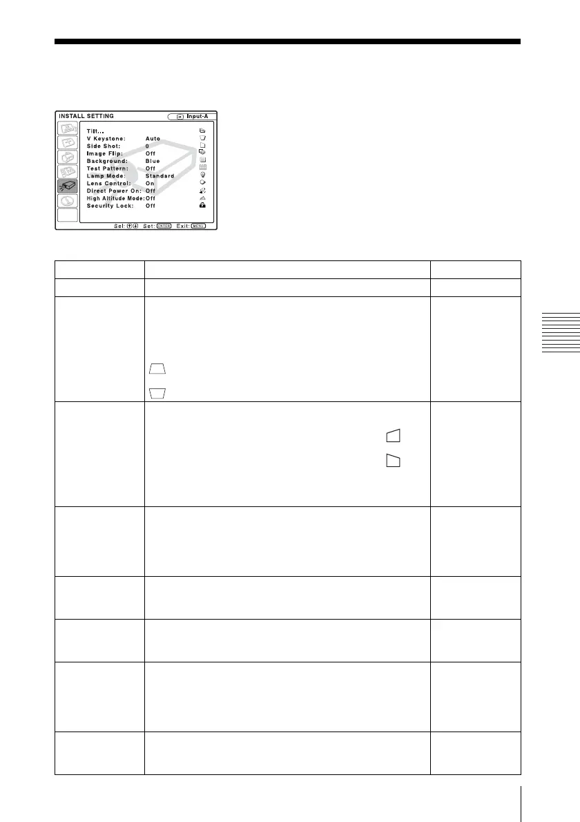The INSTALL SETTING menu is used for changing the settings of the projector.