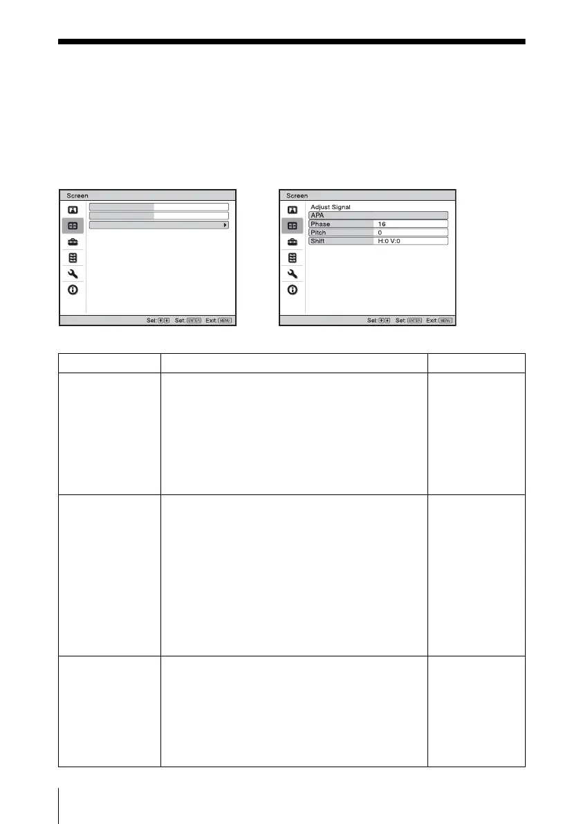 The Screen menu is used to adjust the input signal. You can also adjust the aspect ratio of the