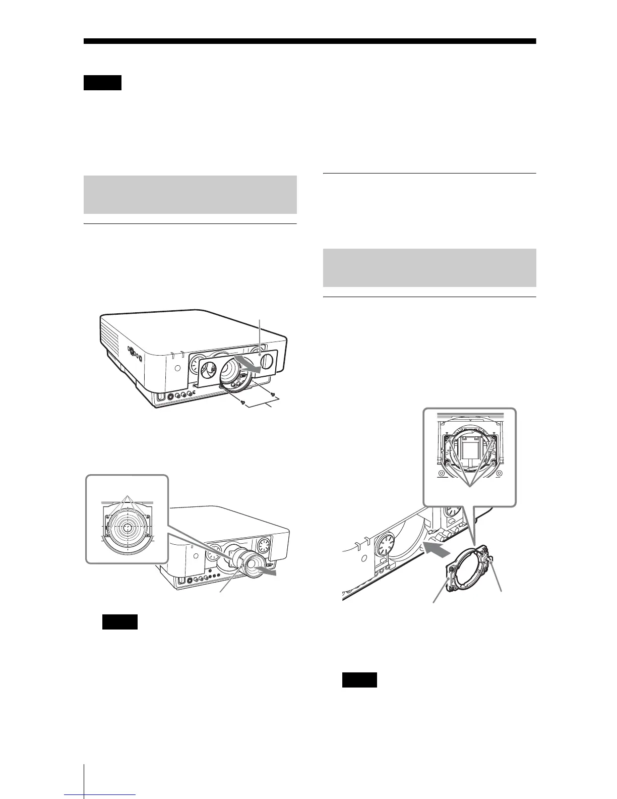 • Avoid removing/attaching the lens with the projector installed suspended from a ceiling.