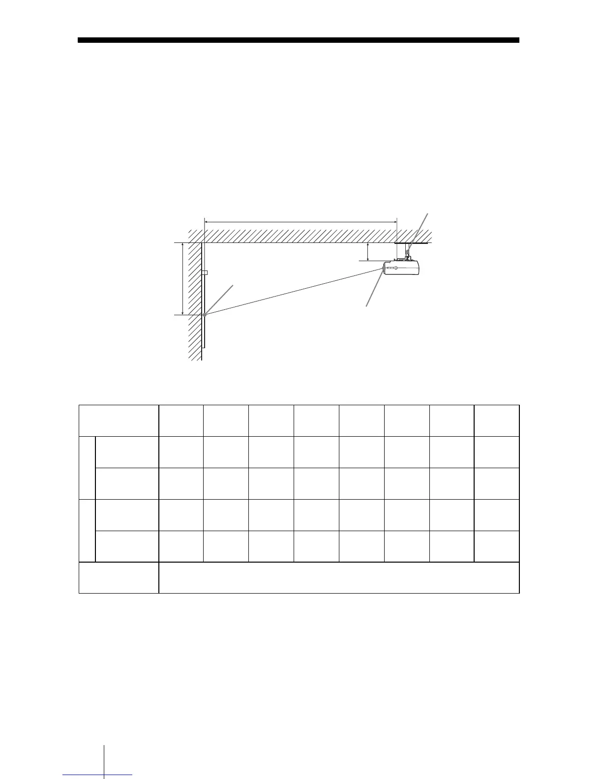 on a ceiling. The projection distances for ceiling installation are shown below.